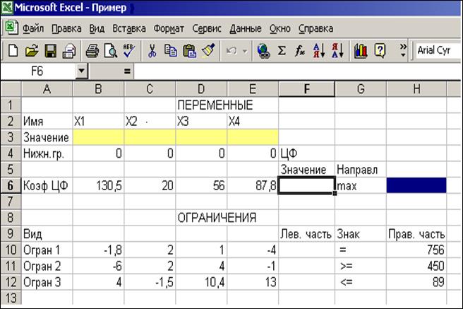Рассмотрим пример нахождения решения с помощью табличного редактора Microsoft Excel, для следующей одноиндексной ЗЛП.