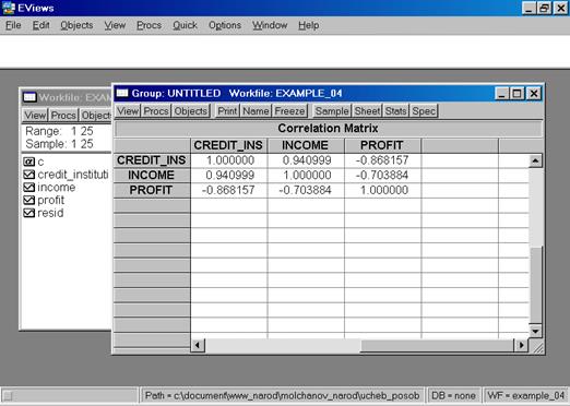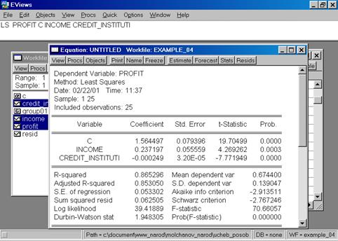 6. Построить регрессионное уравнение МНК, в котором зависимая переменная – прибыль кредитных организаций, а независимые – чистый доход на 1$ депозита и число кредитных учреждений (рис. 60, 61).