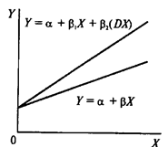 Фиктивные переменные бывают двух типов -сдвига и наклона. Фиктивная переменная сдвига - это переменная, которая меняет точку пересечения линии регрессии с осью ординат в случае применения качественной переменной (рис. 69). Фиктивная переменная наклона - это та переменная, которая изменяет наклон линии регрессии в случае использования качественной переменной (рис. 70). Оба типа фиктивных переменных будут иметь значение