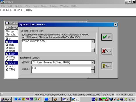 Построим регрессионное уравнение видаLS PRICE C CAT FLOOR (рис 71). Тем самым мы предполагаем (хотя в действительности это может быть и не так), что на цену квартиры оказывают влияние только две, указанные выше, составляющие. В результате получится уравнение следующего вида (рис 72):