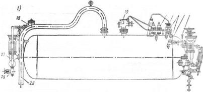 На рис. 7.22 показана примерная схема размещения арматуры на водотрубном котле. На пароводяном коллекторе котла (Рис. 7.22, а, в) установлена следующая арматура: два питательных клапана 5 и 17 для регулирования подачи питательной воды в котел вручную; питательные невозвратные клапаны 4 и 18 для пропуска питательной воды только в одном направлеНИИ – в котел; сдвоенные предохранительные клапаны – главный 19 и импульсный 20; клапаны 10 и 11 пароохладителя, расположенного в водяном пространстве коллектора; водоуказателыше приборы 6 и 12; клапан верхнего продувания 23 и клапан 3 продувания пароохладителя; спускные клапаны 16; воздушные клапаны 7 и 24 для выпуска воздуха из перепускной трубы 25, соединительной трубы конденсационного сосуда и пароохладителя; клапан 1 для отбора проб котловой воды на химический анализ; клапаны 22 манометров, импульсные клапаны 2 и 21 для подачи сигналов к регулятору питания; клапан 9 отбора насыщенного пара.