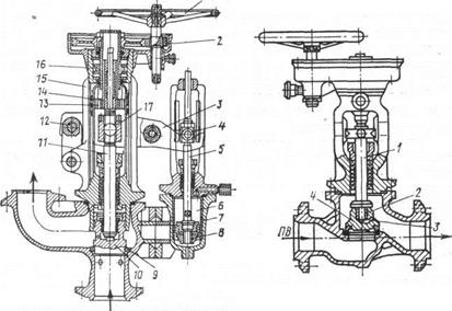 При неисправности зубчатой передачи 2 для перемещения тарелки 10 можно использовать квадрат в верхней части штока. Квадраты на валике маховика 1 служат для присоединения приводов дистанционного управления.