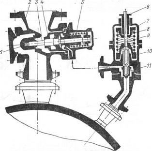 Схема предохранительного устройства непрямого действия показана на рис. 7.25. Тарелка 1 клапана в корпусе 2 главного ПХК сидит на штоке 3 и давлением пара прижимается к седлу. Шток проходит в цилиндре 4 и несет на себе пригнанный к этому цилиндру поршень. На правом конце штока навинчена втулка, отжимаемая вправо небольшой пружиной 5. Эта пружина обеспечивает начальное прижатие клапана к седлу, которое усиливается давлением пара. Тарелка 11 импульсного клапана прижимается к седлу пружиной 8 через нижнюю втулку 10 и шток 9. При давлении выше номинального значения пар приподнимает клапан 11 и по импульсной трубе устремляется в правую полость цилиндра главного предохранительного клапана. Площадь поршня в нем больше площади тарелки 1 клапана, и поэтому шток перемещается влево, открывая выход пара из коллектора в атмосферу. Силу сжатия пружины 8 регулируют с помощью нарезной втулки 6, при вращении которой перемещается верхняя втулка 7, изменяющая высоту пружины, а следовательно, и ее силу сжатия.
