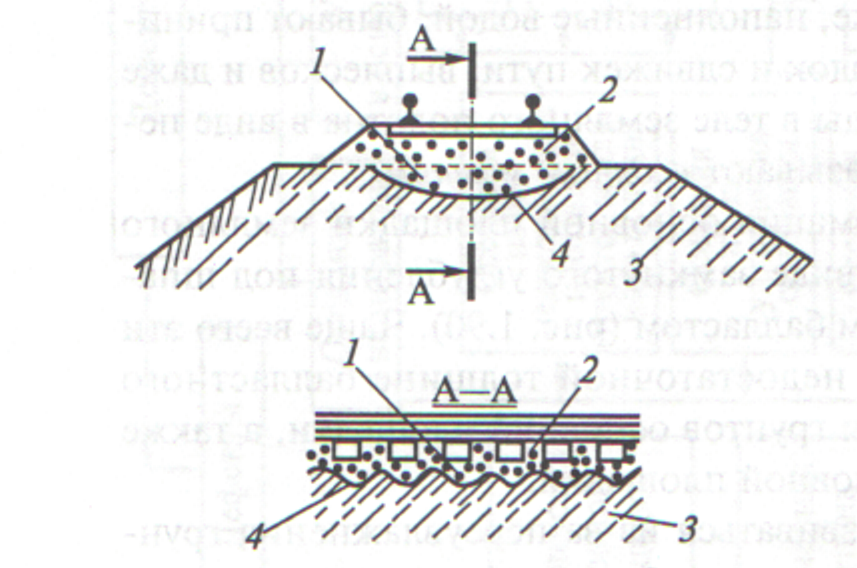 | 1 - корыто; 2 - балластный слой; 3- глинистые грунты; 4 - контакт балластных материалов и глинистых грунтов |