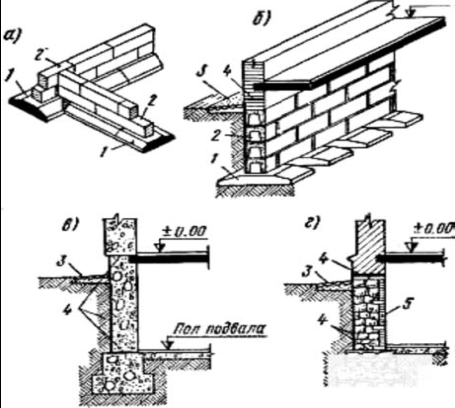 Рис. 3. Конструкции ленточных фундаментов: а — сборный; б — то же, прерывистый; в — монолитный фундамент (бутобетонный); г — бутовый фундамент: 1 — фундаментные подушки; 2 — бетонные блоки; 3 — отмостка; 4 — гидроизоляция; 5 — кирпичная облицовка (в полкирпича)