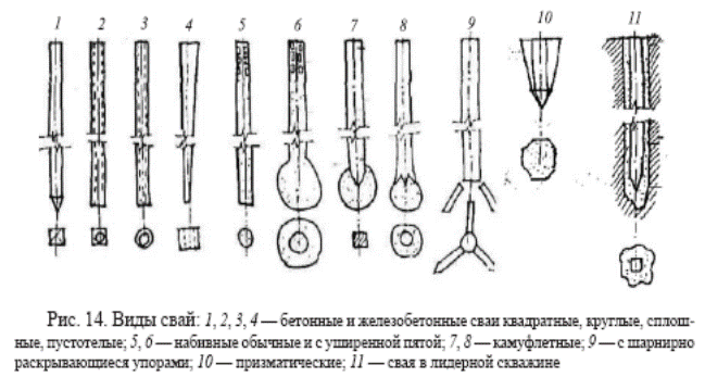 2) по характеру работы в грунте — на сваях-стойках, которые проходят через слабые грунты и опираются на прочный грунт, и висячих сваях (сваях трения), которые уплотняют слабый грунт и передают нагрузку на грунт трением, возникающим между грунтом и боковой поверхностью свай.