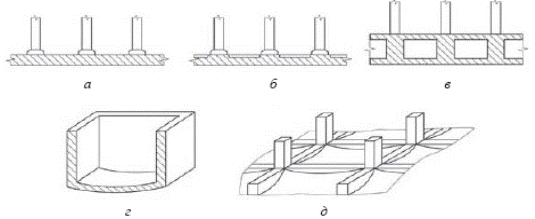 Рис. 15. Сплошные фундаментные плиты: а — под стены или колонны; б — плитно-балочный вариант; в — коробчатые; г — в виде цилиндрических оболочек; д — оболочек двоякой кривизны