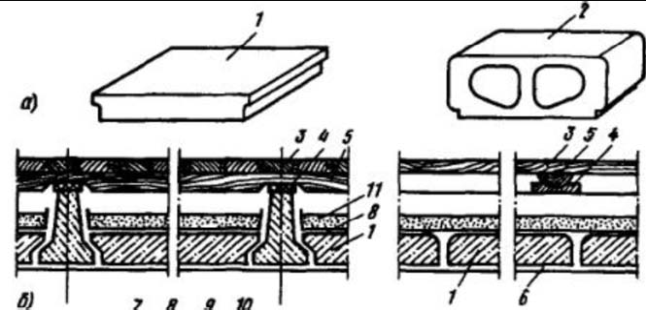 плит; б — заполнением двухпустотными вкладышами: 1 — гипсобетониая плита; 2 — легкобетонный вкладыш; 3 — дощатый пол; 4 — звукоизоляционная прокладка; 5 — лага; 6 — затирка; 7 — оргалит; 8 — толь; 9 —легкий бетон; 10 — чистый пол; 11 — засыпка (из шлака)
