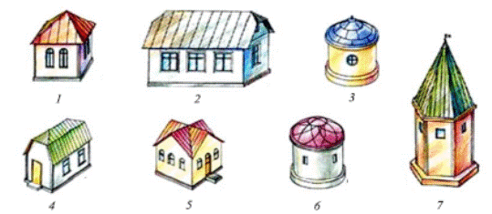 Рис. 41. Формы крыш: 1 — шатровая; 2 — полувальмовая; 3 — конусная; 4 — мансардная с полувальмой; 5 — многощипцовая (четырехщипцовая); 6 — купольная; 7 — пирамидальная (шпилеобразная)