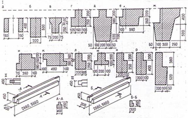 б – одиночный прямоугольного сечения; в – тавровый; г, д – рядовые ригели в виде перевернутого тавра; е, ж, и, к, л – варианты фасадных ригелей; м – коридорный ригель; н, о, п – варианты лестничных ригелей.