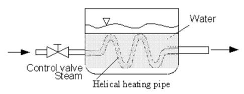 Резервуар с водой должен быть установлен при постоянной температуре. Вода нагревается паром, протекающем по трубе. Скорость потока пара может устанавливаться вентилем.