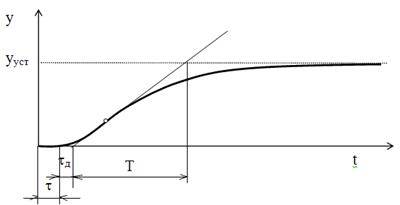 Постоянная времени Т может быть определена несколькими методами в зависимости от вида передаточной функции. Для рассматриваемой передаточной функции 1-го порядка Т определяется наиболее просто: сначала проводится касательная к точке перегиба, затем находятся точки пересечения с осью времени и асимптотой yуст; время Т определяется как интервал времени между этими точками.