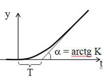 Переходная характеристика в отличие от идеального звена является кривой (Рис. 15) h(t) = K.(t – T) + K.T.e -t/T.