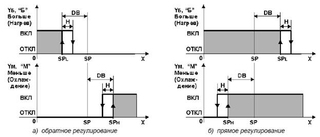 На рисунке 12-а представлена статическая характеристика трехпозиционной системы регулирования при обратном направлении регулирования. Зона регулирования без перекрытия. На рисунке 12-б представлена статическая характеристика трехпозиционной системы регулирования при прямом направлении регулирования. Зона регулирования с перекрытием. Выбор направления регулирования осуществляется в различных микропроцессорных регуляторах по разному: