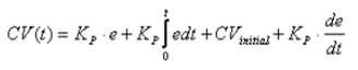 В установившемся режиме PID -контроллер воздействует на выходную величину так, чтобы свести ошибку регулирования (е) к нулю. Ошибка регулирования представляет собой разность между заданным значением SP (setpoint) и значением переменной процесса (фактическим значением) – PV (process variable). Принцип PID-регулятора основывается на уравнении, представляющем регулирующее воздействие CV(control variable) как сумму пропорциональной, интегральной и дифференциальной составляющих.