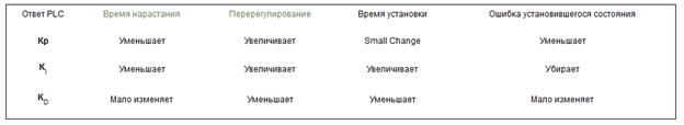 Пропорциональная составляющая регулятора (KP) эффективно сокращает время нарастания и снизит, но не ликвидирует стационарную ошибку - ошибку установившегося состояния (steady-state error). Интегральная составляющая управления (КI) будет иметь эффект устранения установившейся ошибки, но это может сделать переходную характеристику хуже. Производная (дифференциальная) составляющая (KD) будет иметь эффект повышения устойчивости системы, снижение выброса и улучшения переходного процесса. Воздействие каждого из контроллеров Кр, КD и КI на замкнутую систему приведены в таблице ниже