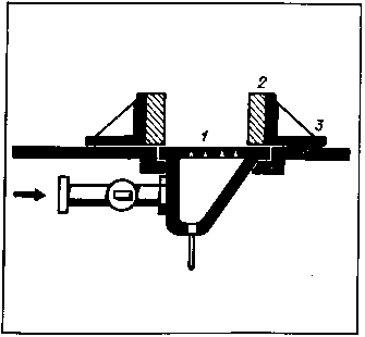 63. Усовершенствованный горн с нижним дутьем: 1 — подовая доска; 2 — обожженные кирпичи; 3 — передвигающаяся чугунная рама
