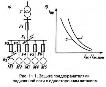 Если в защищаемой предохранителями сети установлены магнитные пускатели или контакторы, то для исключения их отключения из-за снижения напряжения при коротких замыканиях плавкая вставка предохранителя должна перегореть за время tпер = 0,1...0,2 с при повреждении в наиболее удаленной точке сети (для предохранителя F1 точка К1 на рис. 11.1, а). Из анализа защитных характеристик предохранителя следует, что это условие обеспечивается при кратности тока короткого замыкания Iк.min / Iвс.ном = 10...15.