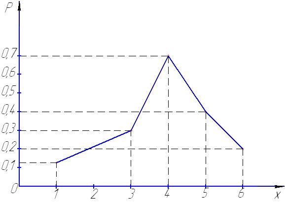 , а затем соединяют их отрезками прямых. Полученную фигуру называют многоугольником распределения. При построении многоугольника распределения следует помнить, что соединение полученных точек носит условный характер. В промежутках между значениями случайной величины вероятность не принимает никакого значения, точки соединены только для наглядности.