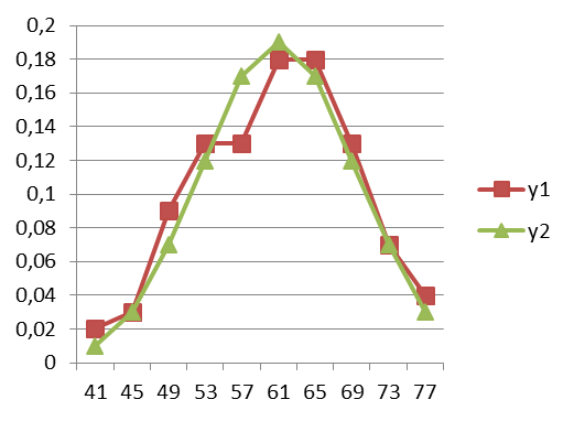 5)По выстроенному интервальному статистическому ряду и эмпирическим относительным частотам построим график, который будет определять вид функции плотности распределения относительных частот (рис. 81 (y1)).