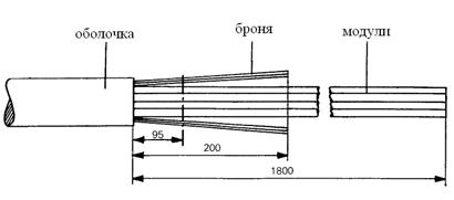 Разделка оптического кабеля выполняется строго по шаблону. Шаблон выбирается в зависимости от конструкций кабеля и муфты (кросса) и, как правило, задается в инструкции по монтажу муфты (кросса). Пример шаблона разделки оптического кабеля приведен на рис. П.1.