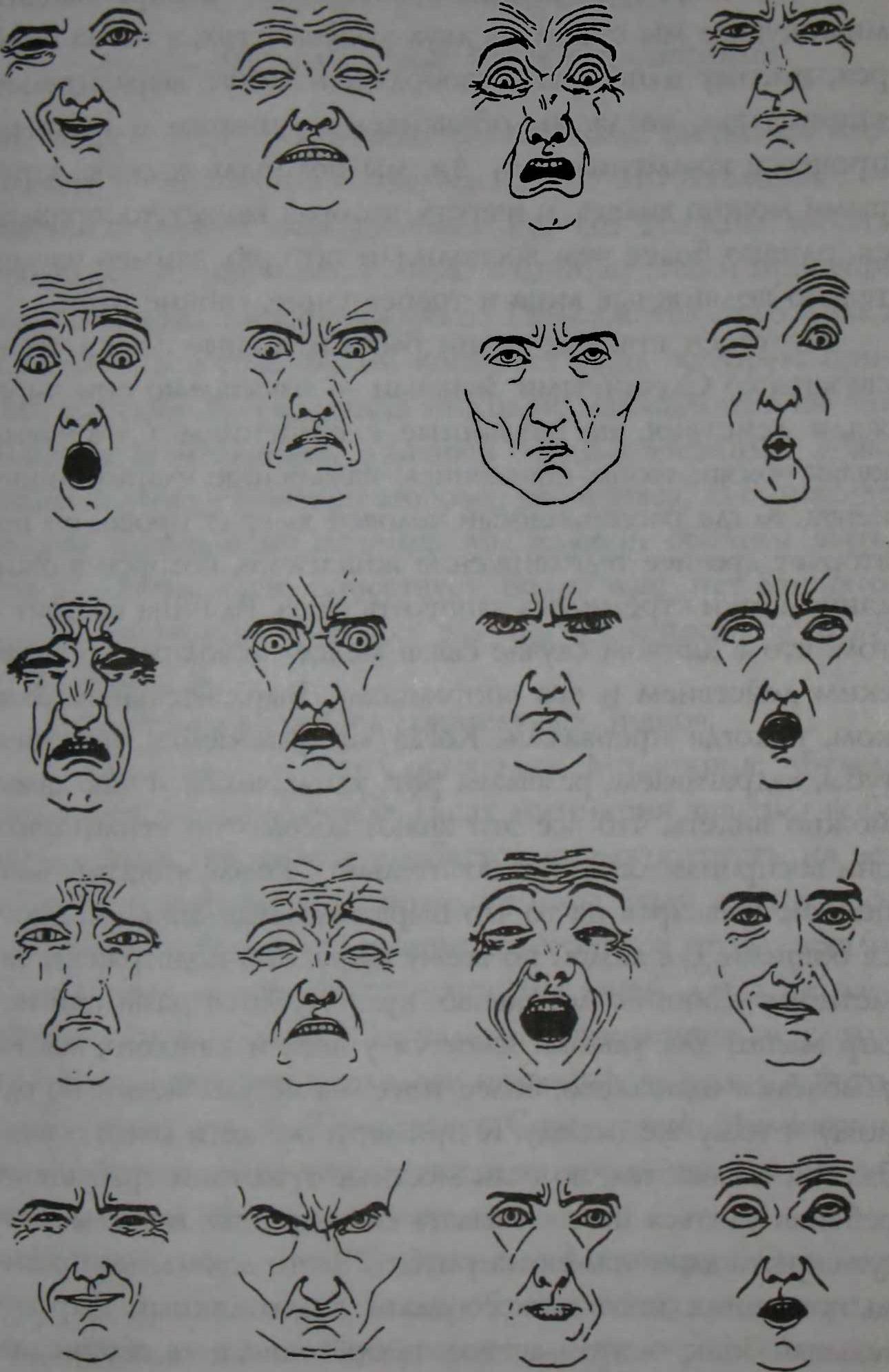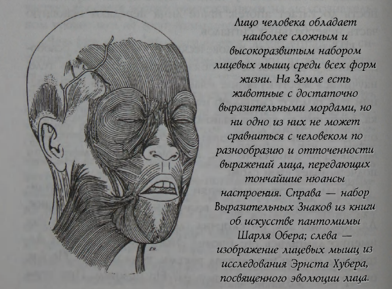 Столь естественные знаки обычно подаются спонтанно и в большинстве своем воспринимаются как должное. Да, говорим мы, он скорчил смешную гримасу. Но как именно двигались его брови? Этого мы не помним. Да, говорим мы, он размахивал руками, пока говорил. Но как он при этом складывал пальцы? Не помним. При этом мы вовсе не были невнимательны. Мы видели всякий знак, и наш мозг зарегистрировал все, что мы видели. Но подвергать подобные действия анализу для нас — то же самое, что произносить по буквам слова, которые мы слышим, чтобы понять их смысл. В этом отношении Выразительные Знаки сродни Случайным из предыдущей категории. Есть и отличие: Выразительный Знак подает сигнал и не выполняет механической функции. Мы делаем такие знаки, когда улыбаемся и усмехаемся, пожимаем плечами и надуваем губы, смеемся и содрогаемся, краснеем и бледнеем, машем и маним, киваем и таращимся, хмуримся и рычим. Эти знаки практически одинаковы во всем мире. В разных уголках Земли они могут отличаться деталями и контекстом, но в общем и целом они знакомы всем нам. У каждого человека есть развитые лицевые мышцы, единственная задача которых — воспроизводить мимику; все мы стоим на двух конечностях, а не на четырех, потому наши руки свободны и могут выразительно «танцевать», когда мы объясняемся, спорим и шутим в процессе коммуникации. Да, мы потеряли хвосты, которыми можно вилять, и шерсть, которая может топорщиться, однако более чем восполнили потерю, заимев изумительно подвижные лица и трепещущие, гибкие руки.