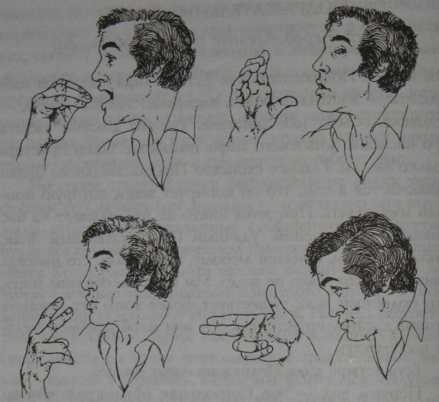 Наши Подражательные Знаки обычно понятны незнакомцам и иностранцам, поскольку они до какой-то степени копируют реальные объекты или действия или подражают им. Аля того чтобы понять сигналы вроде «ем», «пью», «курю» и «стреляю из пистолета», вовсе не нужно погружаться в изучение местных традиций жестикуляции.