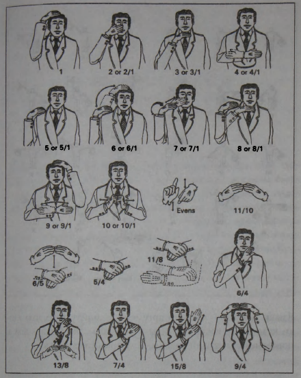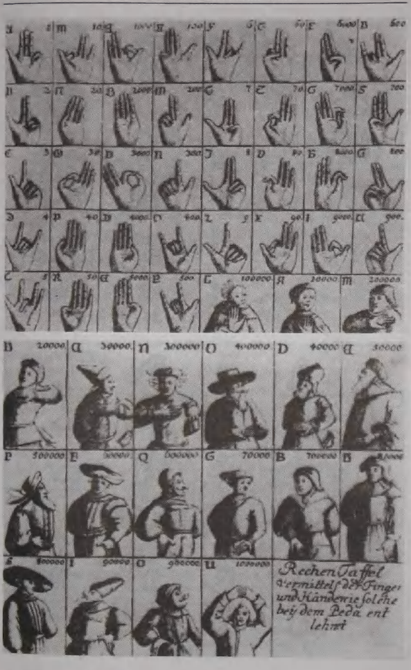 В их числе, например, азбука глухонемых для двух рук и одной руки (слева), система, используемая букмекерами, принимающими ставки на бегах (по Брану), и семафорная азбука, применяемая при морской сигнализации (на следующей странице). Существуют также многочисленные системы «счетных» знаков, включая старинную систему 1724 года (стр. 63).