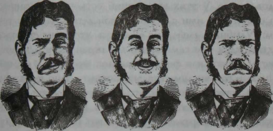 Односторонняя противоречивая улыбка. Закройте одну половину лица листком бумаги — и вы увидите, что человек улыбается; закройте вторую — и вы увидите, что он хмурится. Его губы посылают два противоречащих друг другу сигнала в одно и то же время. Результат можно наблюдать на изображении слева, склеенном из половинок двух других изображений.