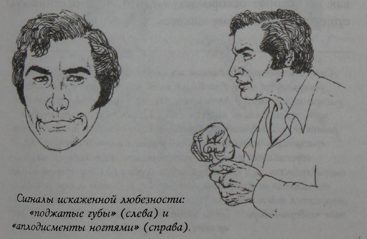 5. Сигналы искажённой любезности. Саркастические оскорбления часто принимают форму искажённого комплимента. Дружеская реакция сознательно трансформируется так, чтобы она стала неприятной. Два очевидных примера тут — «поджатые губы» и «кривая усмешка». И то и другое — искажённая улыбка. Искажение достигается за счёт устранения ряда элементов из комплекса движений лицевых мышц. В случае «поджатых губ» уголки губ поднимаются, как при обычной улыбке, а центральная часть губ сморщивается. В случае «кривой усмешки» мы наблюдаем единственный элемент улыбки, поднятие одного уголка рта, остальные элементы устраняются.