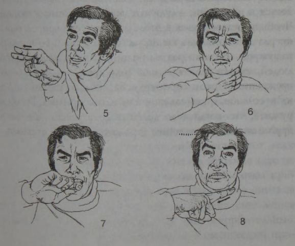 Распространённые формы Угрожающих Сигналов — пустотные знаки (человек нападает на воздух) и перенаправленные знаки (человек нападает на собственное тело). Примеры пустотных знаков: «трясти кулаком» (1); «рубить воздух» (2); «свернуть шею» (3); «придушить» (4); «выколоть глаза» (5). Примеры перенаправленных знаков: человек сам себя душит (6); сам себя кусает (7); символически перерезает себе глотку (8).