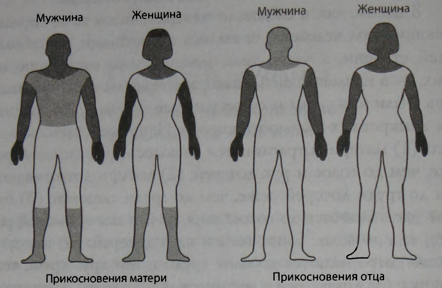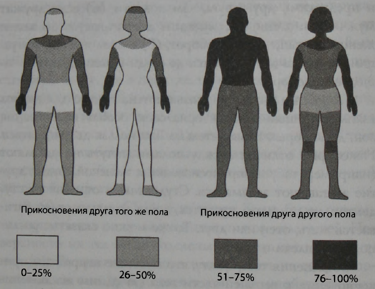 В целом, как и следовало ожидать, части тела, определяющие пол человека, оказались запретными в наибольшей степени, а части тела, максимально отстоящие от них, — в наименьшей. Однако, невзирая на сходство ответов, были выявлены и существенные различия, касавшиеся конкретных взаимоотношений. Например, выяснилось, что: (1) матери дотрагиваются до волос и рук сыновей реже, чем до волос и рук дочерей; (2) матери дотрагиваются до груди дочерей реже, чем до груди сыновей; (3) отцы дотрагиваются до волос, лица, шеи и плеч сыновей реже, чем до волос, лица, шеи и плеч дочерей; (4) подруги реже дотрагиваются до плеч, груди и ног друг друга, чем друзья; (5) друзья реже дотрагиваются до волос, лица, шеи и предплечий друг друга, чем подруги; (6) если дружат мужчина и женщина, мужчина дотрагивается до колен женщины чаще, чем наоборот; (7) в аналогичной ситуации женщина дотрагивается до груди и таза мужчины чаще, чем наоборот.