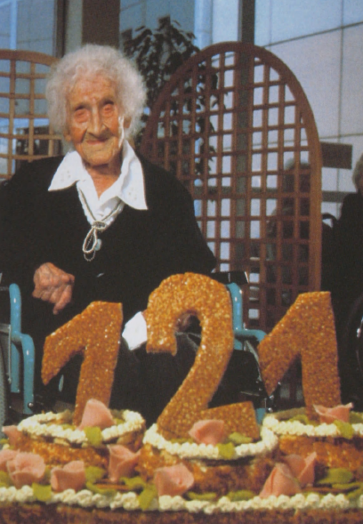 61. Старение. Дольше всех на Земле жила мадам Жанна Кальман, отмечающая на снимке 121-й день рождения. Она умерла, когда ей было 122 года. Мадам Кальман ни разу в жизни не болела, питалась жирной нищей, пила алкоголь и курила сигареты