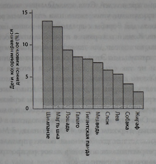 Когда дети становятся старше, их пристрастия в отношении животных меняются. Им начинают больше нравиться маленькие животные вроде галаго и собак, в то время как большие животные, такие, как слон и жираф, теряют популярность. Причина в том, что меняется символическая роль животного в жизни ребёнка: маленькие дети видят в зверях родителей, старшеклассники — младенцев. (Все графики по Моррису и Моррису.)
