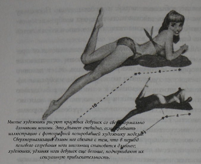 Лишь достигнув отрочества, дети отказываются от преувеличений и рисуют, пытаясь соблюсти естественные пропорции. История искусства, однако, знает немного случаев, когда художники или скульпторы, изображая кого-то или что-то, стремились к точнейшему соблюдению пропорций, наблюдаемых в реальности. Когда люди искусства творят, они уходят от всяких требований к реалистичности. Если человек на рисунке бежит, у него могут быть неестественно длинные ноги; если совокупляется, у него может обнаружиться огромный, ненормально длинный пенис; если выкрикивает угрозы, во рту у него могут появиться невероятно большие клыки. «Сверхнормализация» человеческого тела искусственными средствами, в конечном счете, ограничена, ибо эти средства могут быть слишком тяжелыми или затруднять свободу передвижения. На картине подобных ограничений не существует, потому сверхнормализованные элементы могут увеличиваться в сотни раз.