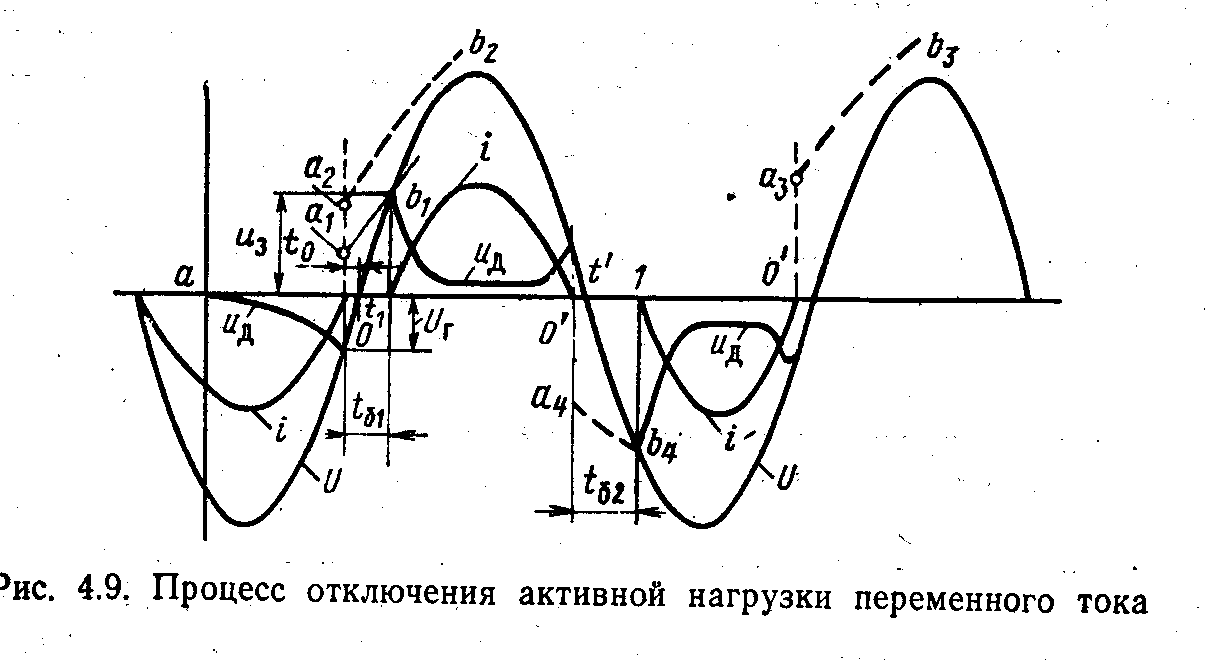 Между ними загорается дуга. К концу полупериода из-за уменьшения тока и воздействия дутогасительного устройства наблюдается увеличение сопротивления дугового промежутка и подъем напряжения на дуге. При подходе тока к нулю к дуге подводится малая мощность, температура ее уменьшается, что