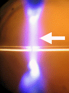 | Рис. П.10. Сварка ОВ: (а) внешний вид дуги; (б) вид зоны стыка в окуляр микроскопа, подача волокна в подвижной каретке 12 |
