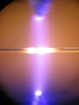 | Рис. П.15. Большой зазор между торцами сращиваемых ОВ приводит к возникновению деформации в виде «спичечных головок» (а); сварка деформированных торцов формирует характерный дефект стыка (б) |