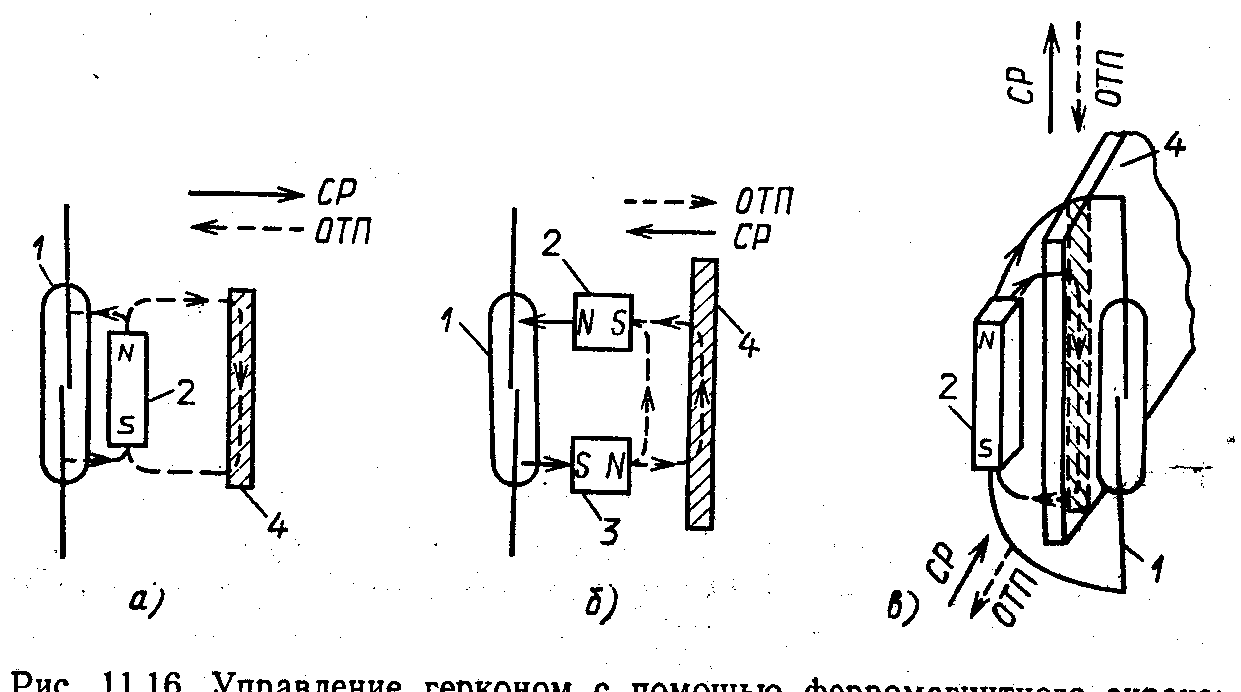 Следует отметить, что при наличии постоянного магнита управление герконом может производится за счет ферромагнитного экрана (рис. 4.2.11).