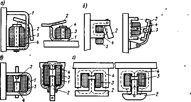 Рйс. 5-1. Схемы электромагнитов: а, б — с поворотным якорем; в, г — с прямоходовым якорем