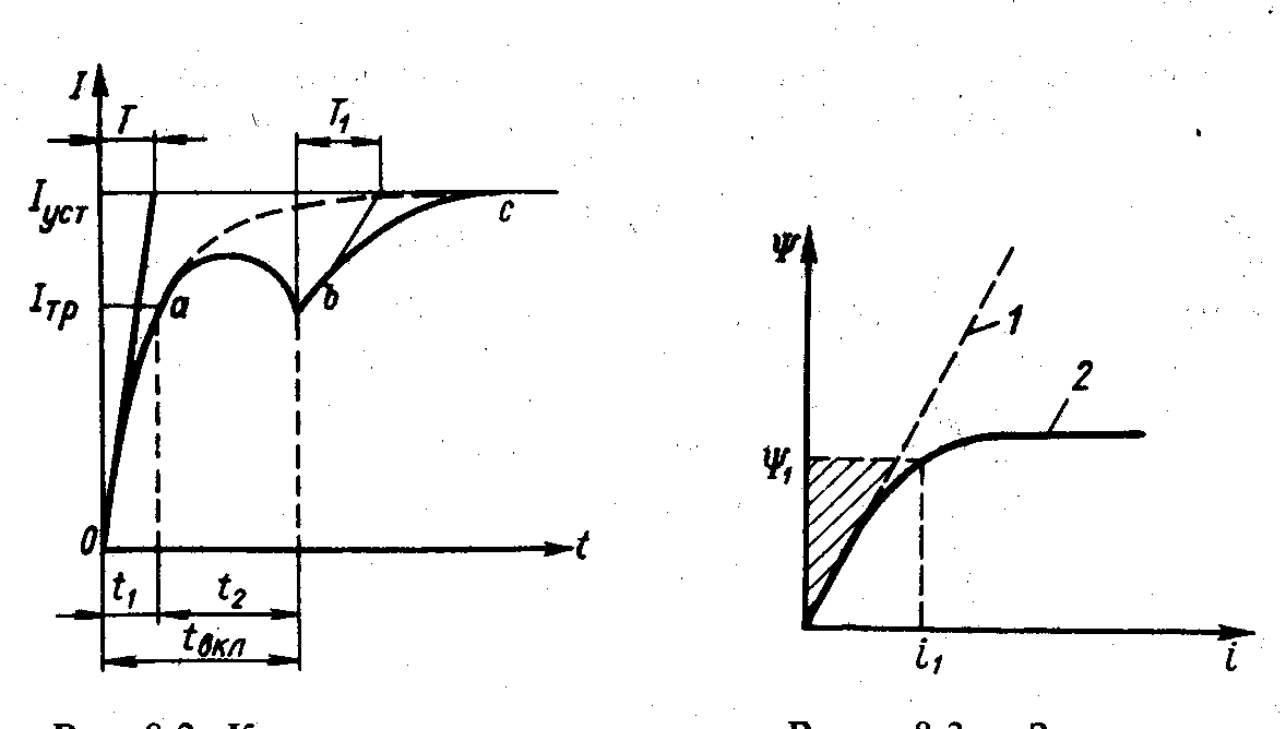 Ф = f(i) представлена на рис. 5-3. Она учитывает нелинейность кривой намагничивания для стали и зависит от тока, материала и размеров магнитопровода и воздушного зазора. Запасенная в электромагните энергия на графике пропорциональна площади, ограниченной