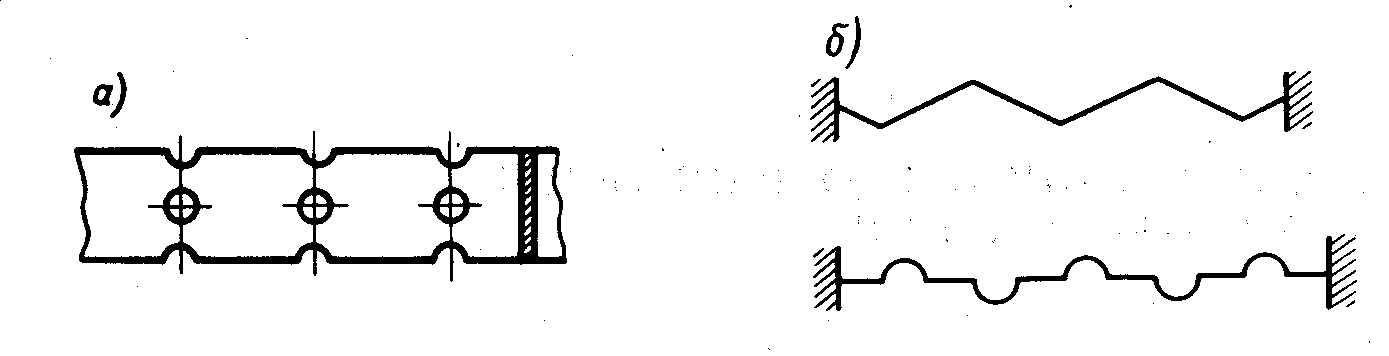 Рис. 6.8. Схемы форм плавких вставок быстродействующих предохранителей: а – плавкие вставки выполнены с перешейками; б – элементы выполнены с изгибами.