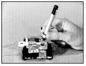 3. Поместите ленту между зубьями держателя на расстояние примерно 25 мм от очищенного участка ОВ и закрепите ленту (рис. П.15.).