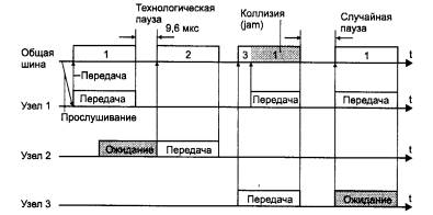 В сетях Ethernet используется метод доступа к среде передачи данных, называемый методом коллективного доступа с опознаванием несущей и обнаружением коллизий (carrier-sense-multiply-access with collision detection, CSMA/CD).