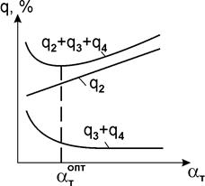 Оптимальное значение коэффициента избытка воздуха будет соответствовать минимальному значению суммы потерь q2 + q3 + q4 .