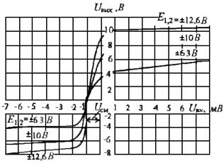 » символизируют наличие очень большого коэффициента усиления у операционного усилителя. Для питания ОУ обычно используют два разнополярных источника питания +Еп1 и –Еп2. Основными характеристиками ОУ являются амплитудные (передаточные) характеристики.