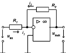 При построении инвертирующего усилителя (рис. 8.28) входное напряжение и напряжение обратной связи подаются одновременно на инвертирующий вход, а другой вход (неинвертирующий) обычно заземлен. Для идеального ОУ, когда можно пренебречь входным током iвх. оу, входной ток i1 инвертирующего усилителя примерно равен току обратной связи i2. С учетом направлений токов на схеме (рис. 3.39) справедливо принять уравнение i1 = – i2. Поскольку для идеального ОУ потенциалы инвертирующего и неинвертирующего входов можно считать одинаковыми, то можно считать, что uвх = R1 i1, uвых = R2 i2, а следовательно, uвх / R1 = – uвых / R2. Из этого уравнения следует: