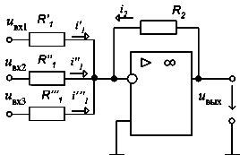 Учитывая, что i1 = uвх1/R'1, i''1 = uвх2/R''1, i'''1 = uвх3/R'''1, а i1 = uвх/R2, получим