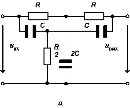 вследствие того, что сопротивления конденсаторов становятся малыми и все напряжение через «нижний» ординарный Т-образный мост (С, R/2, С) передается на вход усилителя.
