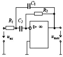 На рис. 8.35 приведена схема избирательного усилителя с интегродифференцирующей обратной связью (R1, C1, C2, R2). Такой усилитель имеет частоту квазирезонанса